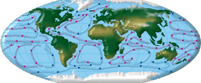 the ocean is a heat sink! the ocean absorbs the majority of the radiation that earth receives from the sun. of course land and gas in the atmosphere play this role as well, but water has a high heat capacity! this is because water has a high specific heat, or it takes a lot of energy to increase its temperature a degree-- the most, actually, out of any liquid. the polar hydrogen bonds require a good deal of energy to break, so when heated the energy goes there instead of towards molecular motiopn, which would increase temperature. so water takes a while to heat up, sure, but also cool down-- so it holds on to the heat. at a heat capacity of 5x that of sand, water is much more resistant to sudden temperature changes, making it a lovely habitat for the fish. us being made of mostly water or whatever (about half by weight) is also surely not a coicidence. #homeostasis. finally, as you know, ocean water is always moving. maybe you don't realize it does so in these large strokes, though, look!